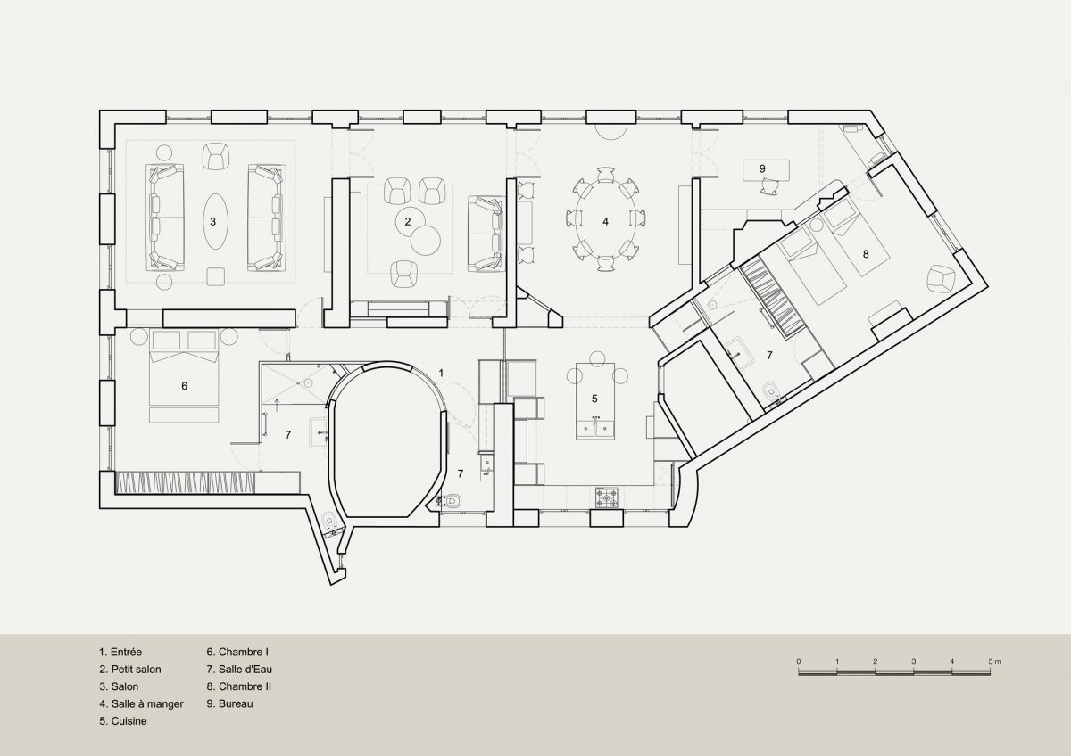 Design et réalisation de l’ensemble du mobilier fixe et non pour: petit salon, cuisine, bureau, chambres et salles des bains.