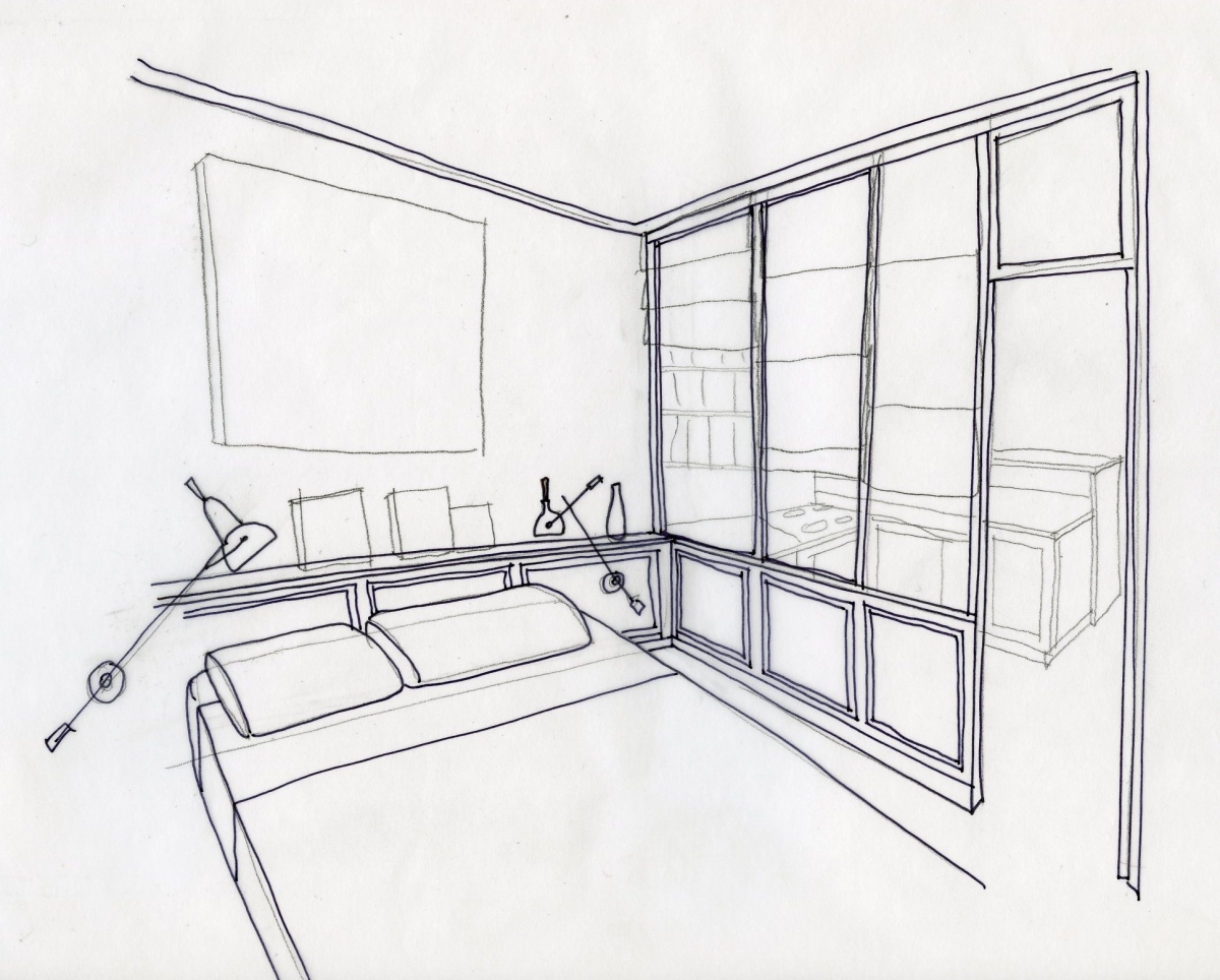 PROJET RÉALISÉ. Conception et suivi de chantiers. Réaménagement d’un espace longue et étroit en deux pièces de vie. Cette baie vitrée intérieure sépare le séjour /cuisine de la chambre, sans arrêter le flux de lumière naturelle.